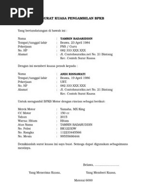 Contoh surat kuasa pengambilan bpkb mobil di acc.