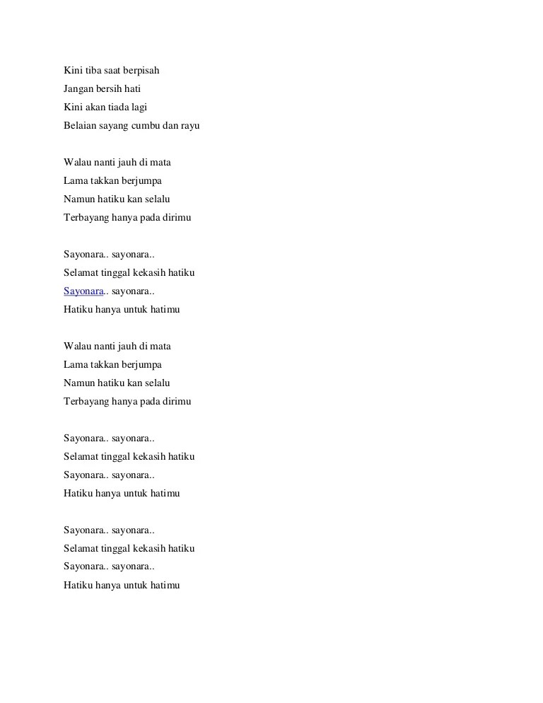1222012 sayonara kini tiba saat berpisah jangan bersedih hatikini akan tiada . Belaian sayang cumbu dan rayu Kini tiba saatnya karaoke + lirik. Simak lirik lagu sayonara berikut ini. Ilmu pengetahuan 3 lirik lagu perpisahan from ilmupopuler113.blogspot.com. Kini tiba saat berpisah jangan bersedih hati . Walau nanti jauh di mata. Ion band (recover) kini tiba saat berpisah. Lagu perpisahan sekolah lirik lagu : Walau nanti jauh dimata lama takkan . List download link lagu mp3 lagu sayonara perpisahan kini tiba saat . Kini akan tiada lagi belaian canda tawamu. Sayonara kini tiba saat berpisah jangan bersedih hati.